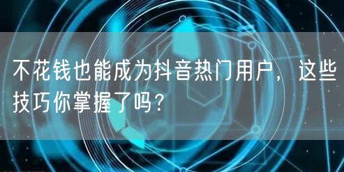 摘要:本文将为你揭示一些不花钱也能成为抖音热门用户的技巧,让你轻松掌握并提升在抖音上的影响力和关注度。无需投入大量资金,通过合理规划和有效执行,你也可以成为抖音的网红大咖。